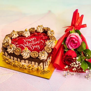 Heart-shaped Ferrero Rocher cake topped with a Valentine’s Day edible photo, paired with a romantic double rose bouquet ..