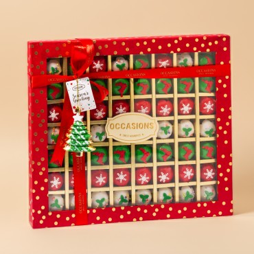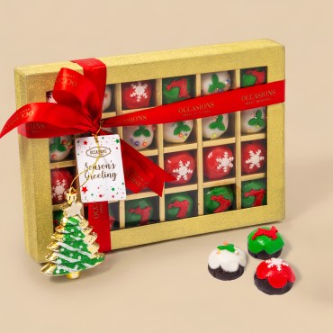 An assorted box filled with bite-sized plum cake balls, topped with smooth fondant and festive Christmas charms. A perfect holiday treat for sharing...